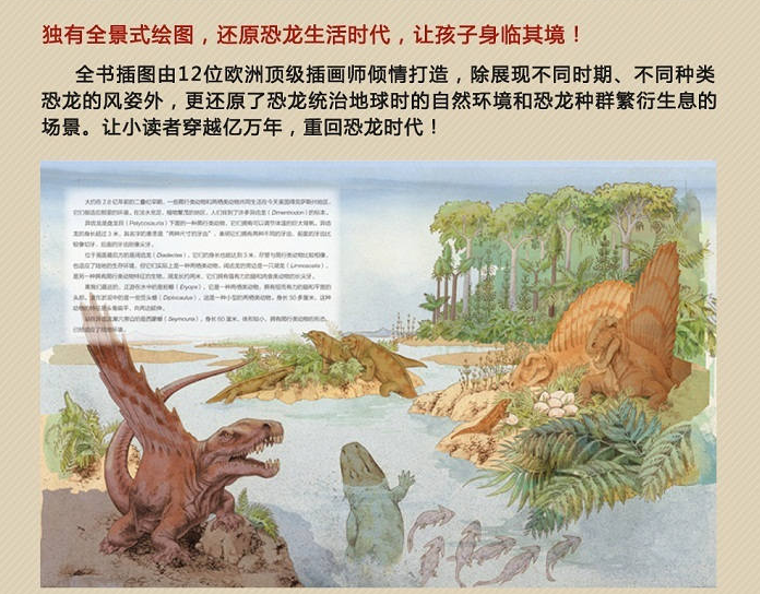 全书插图由12位欧洲**插画师倾情打造,除展现不同时期、不同种类恐龙的风姿外,更还原了恐龙统治地球时的自然环境和恐龙种群繁衍生息的场景。让小读者穿越亿万年,重回恐龙时代!