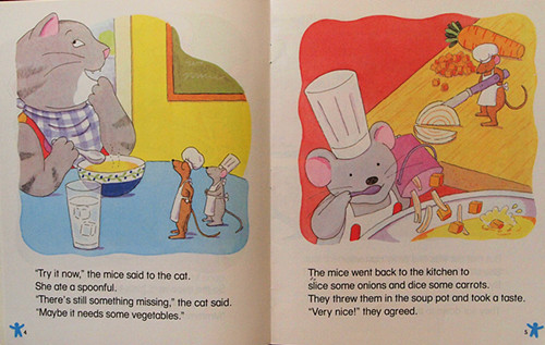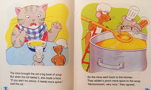 Learn what happens when tow nice mice serve a cat chicken soup with rice. See how quick thinking saves the day in this madcap mouse tale!