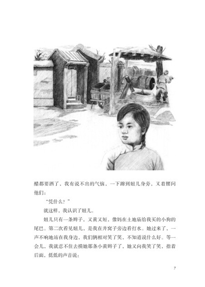 妈正低头嘴里念叨着,准是在算她今天共买了多少钱的东西,好跟无事不操心的爸爸报账,所以妈没留神已经走到了“灰娃馆”。我跟在妈的后面,一直看疯子,竟忘了走路。这时疯子的眼光从洋槐上落下来,正好看到我,她眼珠不动地盯着我,好像要在我的脸上找什么。她的脸白得发青,鼻子尖有点红,大概是冷风吹冻的,尖尖的下巴,两片薄嘴唇紧紧地闭着。忽然她的嘴唇动了,眼睛也眨了两下,带着笑,好像要说话,弄着辫梢的手也向我伸出来,招我过去呢。不知怎么,我浑身大大地打了一个寒战,跟着,我就随着她的招手和笑意要向她走去。——可是妈回过头来了,突然把我一拉:
