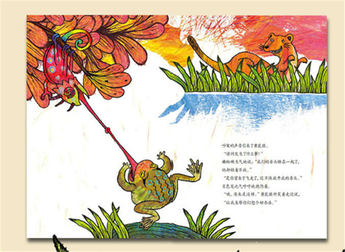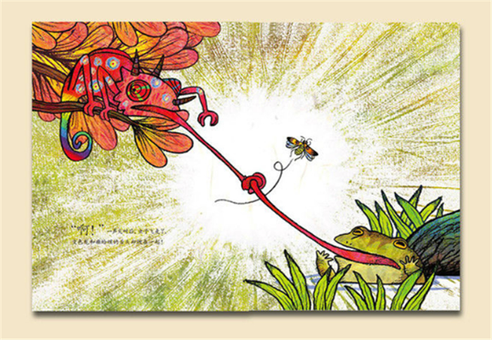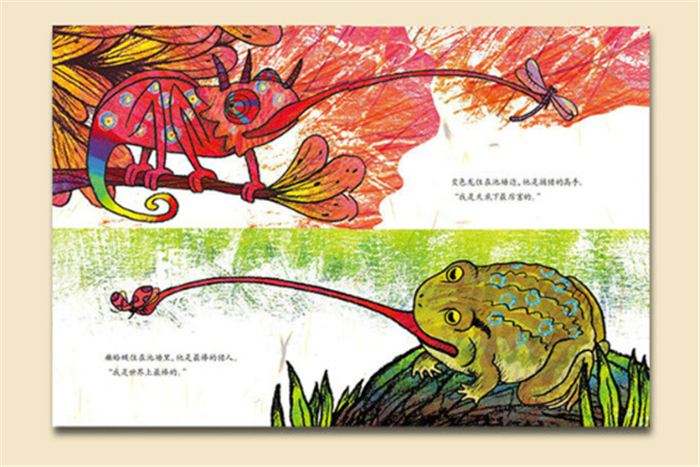 癞蛤蟆与变色龙》从表面上看,描述了势均力敌的两只小动物为了抢一只小飞虫,在经历了矛盾、危机,最后合作,发现可以做好朋友的故事;而实际上却说明了,做好朋友、合作、谦让这些,并不是看起来那么简单的事。这一点从故事最后,又飞来一只小虫吸引了两个猎人的注意这一开放的结尾,画龙点睛地提出。这本书,可以说是很好地将童心童趣与生活哲学结合在一起,是一本送给所有人的书。