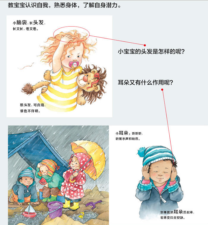 1:教宝宝认识自己身体部位及相关功能2:展现自我认知,增强宝宝的观察、感官和学习能力3:呈现了生活中的社交场景,释放宝宝自由的天性4:镜面设计,认清自我,让宝宝爱不释手5:文字轻快,富有韵律,朗朗上口,让宝宝牙牙学语