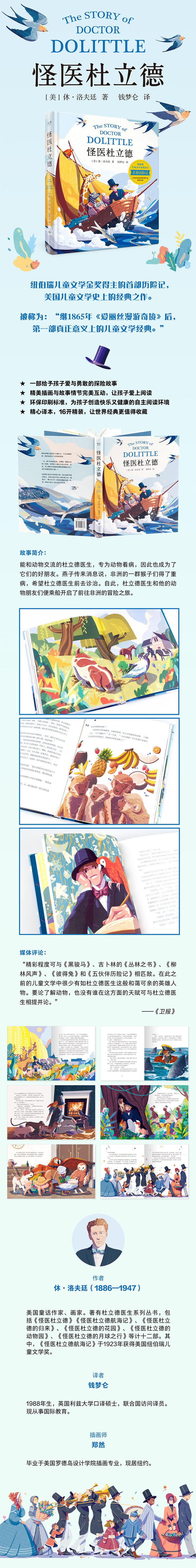 《怪医杜立德》是世界著名的文学作品,作者休·洛夫廷一生共写了12部系列作品,本书是这个系列作品的第一部。泥塘镇有一个医学博士约翰·杜立德,他能听懂动物的语言,而且他也非常爱动物,他的家简直是各种动物的乐园。这里有带着牛犊的母牛,一匹25岁高龄的跛脚马、鸡、鸽子、两只羊羔,还有许许多多其他动物。但他最喜爱的莫过于小鸭达达、小狗吉普、小猪嘎嘎、鹦鹉波利和猫头鹰图图。本书主要讲述了被杜立德医生救下的猴子奇奇,接到非洲亲戚的求救信,让杜立德医生远涉重洋去给猴群治病,并随之展开的惊险刺激的冒险之旅。