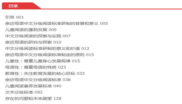 中文分级阅读标准是亲近母语专注儿童阅读和母语教育20年探索和实践的成果。由文本分级标准和儿童阅读素养发展标准两部分构成,年龄涵盖0~18岁儿童。文本分级标准从汉语的母语特性出发,多方面考察各阶段儿童适合阅读的文本特征;儿童阅读素养发展标准将培养儿童阅读兴趣,提升儿童阅读能力,促进儿童精神成长作为总目标,倡导通过阅读教育,在儿童成长的各个阶段落实阅读素养的发展要求,奠定儿童终身学习的基础。