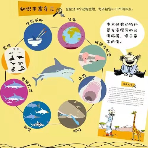 这是一套从法国引进的低幼类图画书。全系列共10册书,10种动物,作者用最简洁的语言,讲述了10种动物的习性和它们所喜爱的世界,共包括:狼,鸵鸟,海狸,狮子,熊,奶牛,鲸鱼,鲨鱼,兔子。知识含量丰富,有利于培养孩子的观察能力和对于知识拓展的联想。