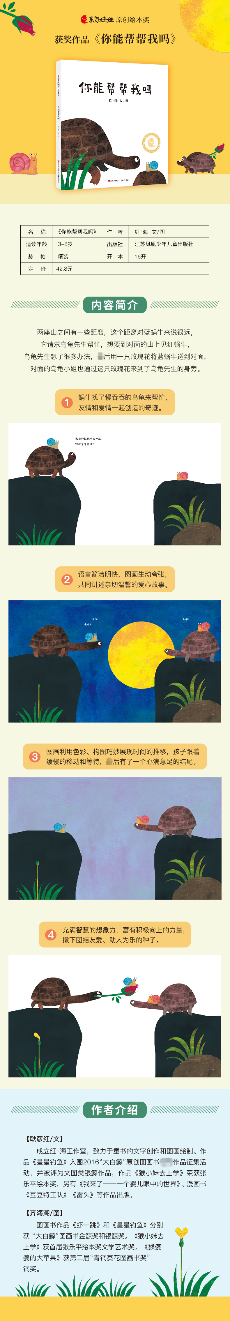 《你能帮帮我吗》用简洁明快的文学语言和生动夸张的画面,共同讲述一个温馨的爱心故事。绘本洋溢着充满智慧的想象力,富有积极向上的的力量。精简的文字,让图画利用色彩、构图巧妙展现时间的推移。特别是那颗太阳的升起、落下,太阳颜色、位置的改变和四周色彩的流转,不仅展现日夜的时间流动,也让这个选用蜗牛和乌龟当主角,邀请读者跟着缓慢的移动和等待,而后有了一个心满意足的结尾。