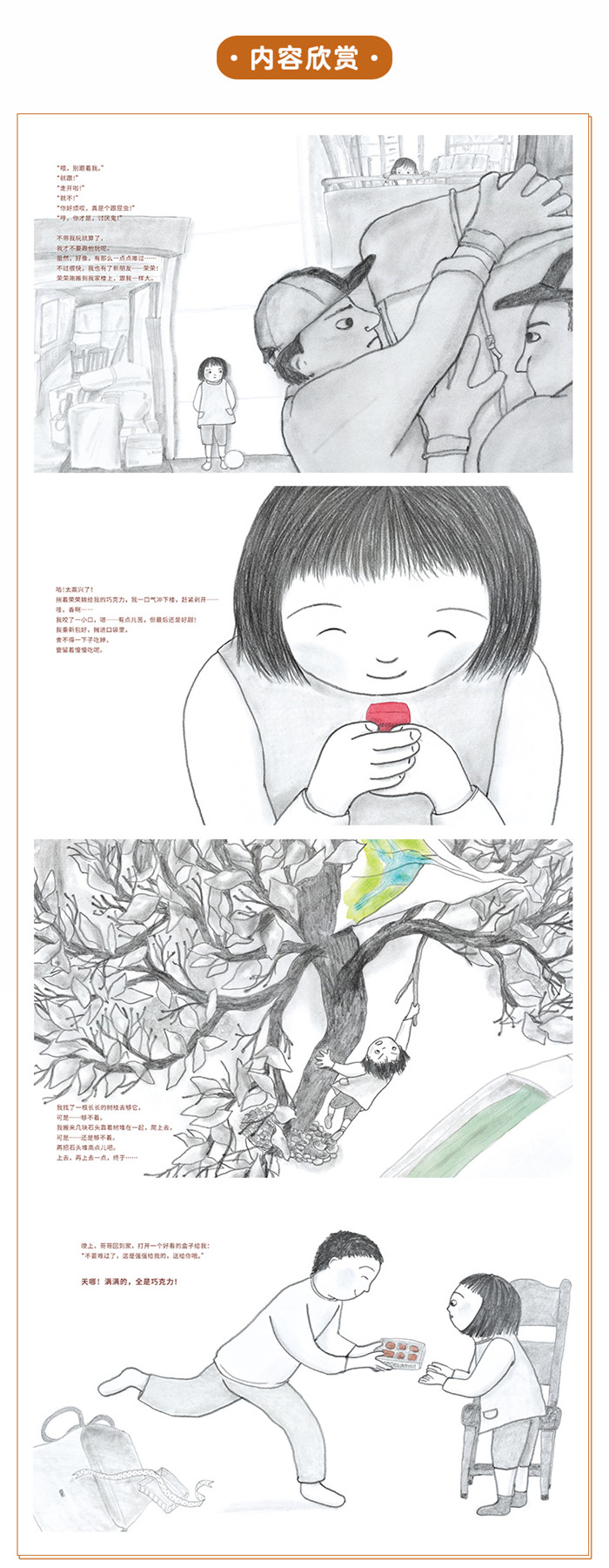 哥哥上学后交了新朋友强强,就很少和毛毛玩了。 毛毛只好去找楼上的荣荣一起玩。一次,两个女孩比赛纸飞机,毛毛的飞机飞到了远处的梧桐树上,因此赢得了一块珍贵的巧克力。可是回到家后,毛毛发现折纸飞机的纸是哥哥要送给强强的画,于是她爬上树去取那架纸飞机,巧克力却从口袋掉了出来……