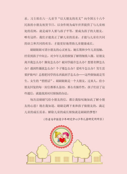刷刷写的《蘑菇班的秘密》(男生版、女生版)是一套有助于青少年的优秀图书。它的内容妙趣横生、形式独特,必将成为广大青少年热读的好书!(中国关心下一代工作委员会副秘书长、中国少先队工作学会名誉副会长、中国儿童少年基金会功勋理事 李启民) 每次读刷刷写给小朋友的信,都让我惊叹她如此了解小朋友的心思!现在我知道,刷刷是蹲下来和孩子做朋友的,满足儿童的成长需求、解除儿童的成长烦恼就是刷刷的梦想!刷刷这套书就像一位朋友陪伴在你的左右。在你烦恼的时候善解人意,化解你的忧伤;在你惶惑的时候轻声细语,解除你的疑虑;在你快乐的时候犹如知己,分享你的幸福。阅读这样的书会令你更智慧、更自信、更快乐、更幸福!(中国青少年研究中心少年儿童研究所所长 孙宏艳) 青少年的成长过程充满快乐、幻想、痛苦、彷徨,孩子们需要关怀、鼓舞和激励。这套书选取了生活中的点点滴滴,娓娓道来,给孩子们以启迪,伴随他们走过人生*珍贵的时光。(江苏省科普作家协会常务副理事长《科学大众》杂志社社长夏军) 这一套集教育、生活、科学、文学多种元素为一体的小丛书,是专门写给成长中的少男少女们看的。它的故事幽默、真实、有趣,是小学生青葱岁月之中的枕边书,是青少年成长和进步的“好老师”。(著名诗人、儿童文学作家、评论家 樊发稼) 这套小丛书不仅值得少男少女捧读,也值得家长和老师捧读,书里的故事记录了孩子们的种种苦恼,刷刷姐姐的回信处处体现出对孩子的关爱和对孩子的鼓舞,是一套让孩子心灵温暖的图书,也是家长和老师了解孩子内心的图书。(著名儿童文学作家、评论家 安武林)