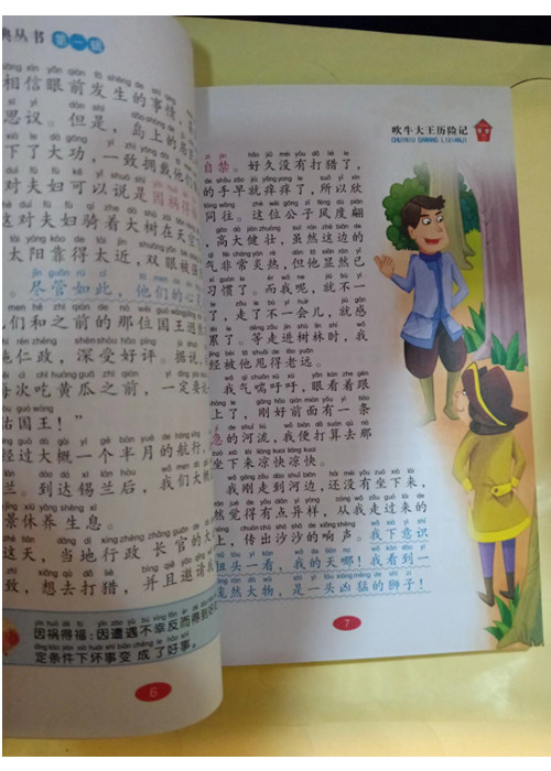 《吹牛大王历险记》的编加过程中,我们在文前设置了“名师导读”和“价值阅读”栏目,帮助小读者整体把握文章特点,提高阅读效率,掌握阅读方法;在文中设置了“成长启示”“要点思考”“阅读链接”等栏目,为小读者提供一个理解文章内容、开阔拓展思维的途径,培养其阅读兴趣。此外,为了减少阅读障碍,加深对文本的理解,此外,我们还对一些比较难认和难理解的字、词添加了注音······