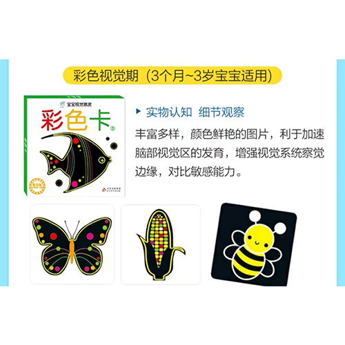 0~3岁是宝贝大脑发育的黄金期。 通过黑白卡、彩色卡激活宝宝视觉神经系统, 促进全脑发育与对明暗、图形的感知。 提升观察力、培养好奇心和探索能力。