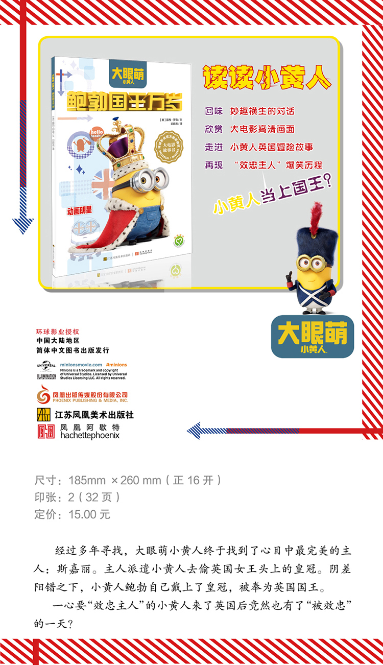 《小黄人:鲍勃国王万岁》是环球影业官方授权简体中文版图书,书中截取大电影精彩图片,讲述小黄人在英国的冒险故事,再现小黄人“效忠主人”历程的爆笑事迹。