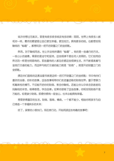 这是一本理财实践指导手册,告诉家长可以通过哪些方法和活动,来培养孩子的经济意识和财商,例如家长可以让孩子去不同的场所买东西,体会不同卖场的价格差异和经营特色;家长还可以带孩子去银行开立账户,告诉孩子关于金融机构的相关知识。