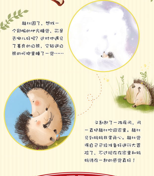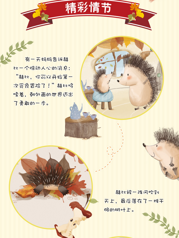 《小刺猬赫比的大冒险》:《小刺猬赫比的大冒险》讲述了一只在秋天出生的小刺猬赫比在妈妈的鼓励下独自外出觅食。由此,赫比开始了它神奇的冒险之旅。在经历了一系列磨难之后,赫比终于回到了妈妈的身边。