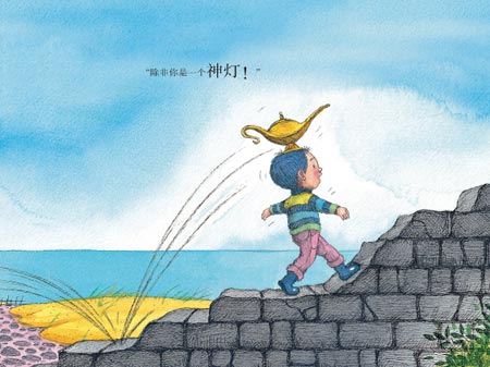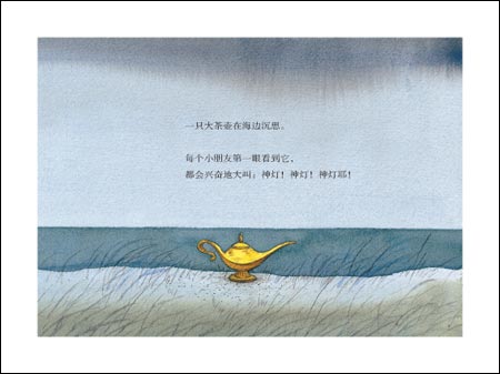 小男孩做了一个梦,梦中他看到一个男孩阿拉丁在海边捡到一只大茶壶。他和漂亮的大茶壶度过了一个美好的下午,等到傍晚阿拉丁准备回家要和大茶壶分别时,大茶壶依依不舍,因为阿拉丁是仅有的不以为它是神灯而拼命在它肚子上擦拭的人。大茶壶不想和阿拉丁分别,但阿拉丁的妈妈不准他乱捡东西回家,除非......大茶壶是一个神灯!