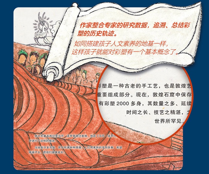 ①当代著名画家刘巨德老先生倾情推荐 ②大师级获奖画家刘涛老师用五色土在皮麻纸上手绘而成 ③100 全彩绝美插画,生动还原历史上鲜活、生动的敦煌,给孩子一场视觉与想象力的盛宴 ④权威学者任昭君严谨考据,梳理敦煌知识,文字通俗易懂、精妙生动,提升孩子写作水平 ⑤读了这套书,相当于给孩子上了一堂艺术课、文化课、历史课 ⑥读懂敦煌,就相当于读懂了中国传统文化的一半。 ⑦专家一辈子研究不尽的敦煌学,怎么让孩子轻松读懂?讲透知识点、拓宽知识面、串联知识线,让孩子轻松读懂敦煌。