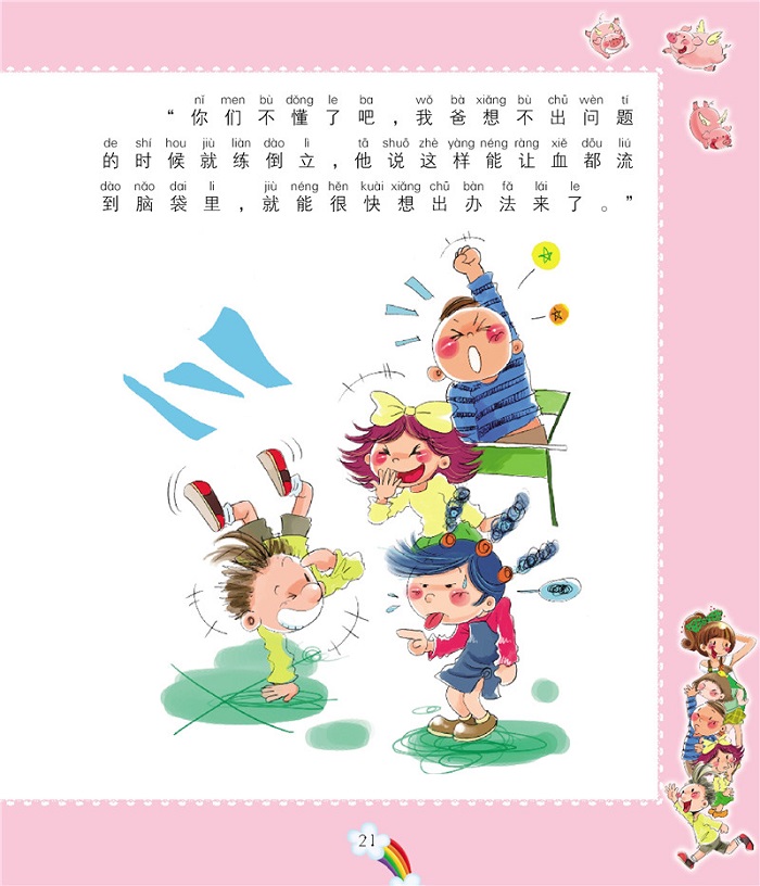 比石头还硬的蛋 端午节到了。这一天,二年级二班的同学们要举办一项活动——顶蛋,也就是看谁带来的蛋硬。 黄美美特意让妈妈挑了一个大个儿的红皮鸡蛋,妈妈说,这个鸡蛋可不是普通的鸡蛋,是笨鸡蛋,是山里吃虫子的鸡下的蛋,营养丰富,味道可好了! 黄美美才不关心蛋的营养和味道呢!她追着问妈妈:“这个蛋硬不硬?” “硬!”妈妈说。 “真的很硬吗?”黄美美缠着妈妈问。 锅里的油冒烟了,妈妈顺口开玩笑说:“可硬了,比石头还要硬呢!” 黄美美揣着“像石头一样硬”的熟鸡蛋充满信心地来到学校。她现在就等着中午的顶蛋大赛了。 到了中午,甜甜老师一声令下,比赛正式开始了。当黄美美看到小豆豆手心里的那个像玻璃球大小的鹌鹑蛋时,差点儿笑到桌子底下。 “小豆豆,你的鹌鹑蛋得管我的鸡蛋叫爷爷哟!而且我妈妈说了,我的鸡蛋可是笨鸡蛋,比石头还硬呢!”黄美美得意地说。 小豆豆神秘地笑着说:“别小瞧我的鹌鹑蛋,看招吧!” 黄美美虽然不忍心用大蛋欺负小蛋,可是小豆豆已经把鹌鹑蛋顶到了她的鸡蛋上。黄美美使足了劲儿,只听啪的一声,黄美美刚想向小豆豆说对不起,却发现自己的鸡蛋居然被一个小小的鹌鹑蛋顶破了皮。 “你——”黄美美简直不敢相信自己的眼睛。小豆豆得意地一笑,跑到别的桌去比赛了。 黄美美伤心地把鸡蛋的“尸体”装进塑料口袋。“唉,老妈真是害死我了!” “哎呀——”突然,坐在黄美美后面的何小米尖叫了一声。黄美美一看,何小米的手上黏糊糊的,原来她带了一个生鸡蛋和田大壮顶,结果一下就被田大壮打败了,蛋清和蛋黄弄了她一手。 黄美美连忙递给何小米一块抹布。看着何小米龇牙咧嘴的滑稽样儿,黄美美很庆幸妈妈没有给她带个生鸡蛋来比赛。 “哈哈——”从教室后面传来一阵笑声。黄美美跑过去,只见小豆豆正准备用那个“小不点儿”挑战吕跳跳的大鹅蛋。