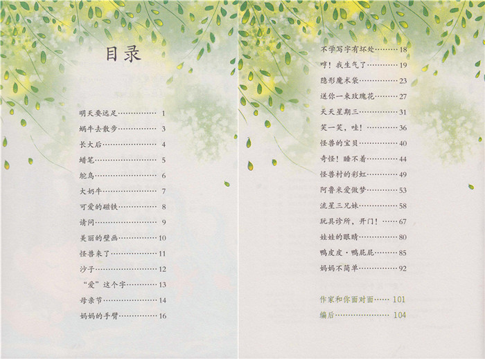 语文教材中选用了方素珍的作品《明天要远足》,此作家的作品受到学生的喜爱,也说明她的创作质量达到了相当高度。本书选取了该作家的其他作品,如《蜗牛去散步》《长大后》《鸵鸟》《大奶牛》等十几篇儿歌,以及《妈妈的手臂》《送你一束玫瑰花》《怪兽的宝贝》《阿鲁米爱做梦》等十几篇童话故事。本系列作品让学生学完课文后,延伸阅读该作家的其他文章,是拓展阅读面、了解作家作品的重要方式。编者根据小学低年级的阅读能力和阅读要求,精心选择文章,按照难易程度排列,本书可作为小学一年级课外读物。
