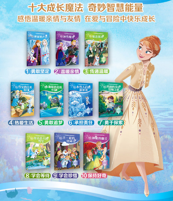 1.这是一场汇集冰雪奇缘各个人物的精彩故事盛会,10个精彩故事,让孩子进入奇幻冰雪世界,和艾莎安娜一起经历10段冒险旅程。