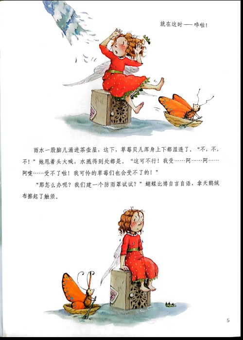 雨真大啊,草莓苗都垂下了脑袋!草莓贝儿很快想出了解决办法;寻找一个美丽的新家!什么也不能影响她的好心情!
