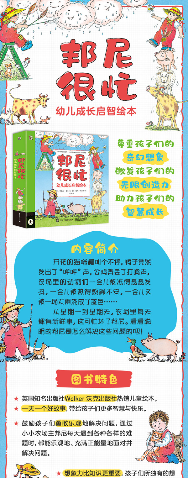 开花的猫咪柳叫个不停,鸭子竟然发出了“哞哞”声,公鸡弄丢了打鸣声,农场里的动物们一会被冻得瑟瑟发抖,一会被热得烦躁不安,一会又被一场大雨浇成了蓝色……从星期一到星期天,农场里每天都有新鲜事,这可忙坏了邦尼。看看聪明的邦尼是怎么解决这些问题的吧!
