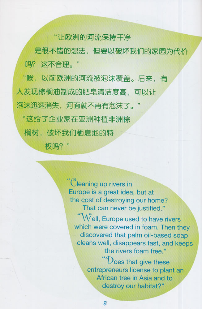 “让欧洲的河流保持干 净是很不错的想法,但要以破坏我们的家园为代 价吗? 这不合理。” “唉,以前欧洲的河流被泡沫覆盖。后来,有人 发现棕榈油制成的肥皂清洁度高,可以让泡 沫迅速消失,河面就不再有泡沫了。” “这给了企业家在亚洲种植非洲棕 榈树,破坏我们栖息地的特 权吗?”
