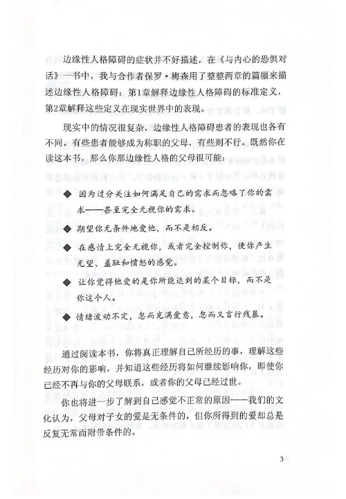 拥有不理想的童年,其实你并不孤单。很多父母因其自身的人格障碍而把自己的欲望强加到孩子身上。导致孩子的各类生理及心理需求得不到满足,在很小的年纪就承受常人无法想象的压力,对于外界事物感到害怕恐慌,产生童年阴影。本书即是治愈童年创伤的良药。作者从过去、现在、将来这三个时期入手,深入剖析了童年阴影产生的原因,并对症下药,有针对性地进行逐步治疗,帮助你克服各种心理障碍,重建自我。