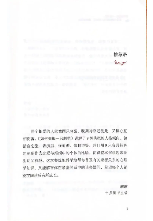 世界上没有接近相同的两片叶子,也没有接近相同的两个人。不同的人会演绎出不一样的爱情。人格是爱情质量的重要影响因素。爱情也是人们改善人格缺陷的宝贵机会。 《如何拥抱一只刺猬:恋爱与婚姻中的人格识别、接纳与付出》涵盖了九大人格类型,并且围绕每一种人格类型介绍了一个以该种人格类型者为主人公的爱情故事。通过本书,读者可以学习在亲密关系中各个人格类型者会有什么样的表现和感受;他们的恋人会有什么样的表现和感受;他们为什么会有这些表现;双方应该做些什么让爱情更甜蜜。从书中看到自己的爱情故事的影子,或者找到实用的建议。此外,针对每种人格类型,作者也精选了一部影视作品或戏剧作品,为读者深入理解该人格类型提供了资源。 本书适合所有对亲密关系感到困惑的人,能够帮助读者理解自己,理解恋人,理解爱情。