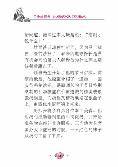 在本册书中,闪电球探长将要找出在领事先生的汤锅里放进一只红色的袜子的嫌疑犯,他能顺利找出这个可恶的恶作剧者吗?当闪电球探长在沙滩晒太阳的时候能发现什么惊天秘密?他能破解关于“天空之眼”的谜语么?在破案的过程中小侦探们还能学到什么有趣的科普知识呢?你知道滑轮的秘密吗?棉花什么时候开花?