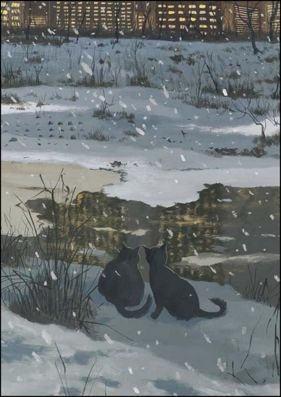 原野上长着很高的枯草,草丛里每隔一段距离就立着一座坟墓和石碑,石碑一直延伸到天边。天空变成了深灰色,天边还泛着红光,冰冷的风呼呼地吹着,拂过猫咪们的皮毛。猫咪们的心里突然感到一阵凄凉和悲伤,不知道为什么,眼泪都快掉下来了。