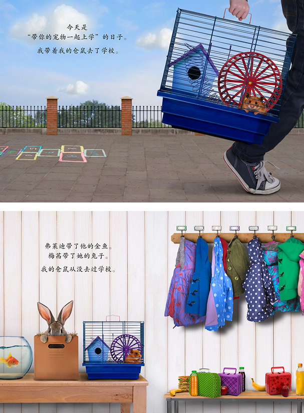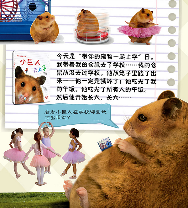 今天是带着自己的宠物去学校的日子,所以我带上了我养的仓鼠去学校,我的仓鼠从来没有去过学校,所以它不仅吃光我打包去学校的午饭,还吃光了所有人的午饭,就这样,它的身体越来越大,越来越大……给予孩子无尽的思考。