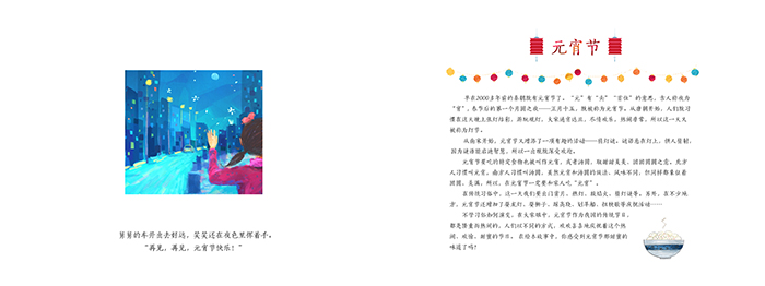 在中国传统节日中,元宵节常常与热闹、欢愉的气氛相伴随,是春节之后的第一个重要节日,元宵节也是看灯会的灿烂时节。本书以儿童生活故事为主线,以中国传统节日为主题,中间穿插元宵节的来历、汤圆的做法、猜灯谜等相关的节日习俗,再加上场景的远近、视角的变化、颜色的情感意味、图形符号的象征意义、叙事节奏的把握等,都是为了让小朋友们在故事的氛围中不知不觉了解中国传统文化,实现了心灵启迪、故事欣赏、传统文化学习等的融合。