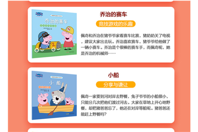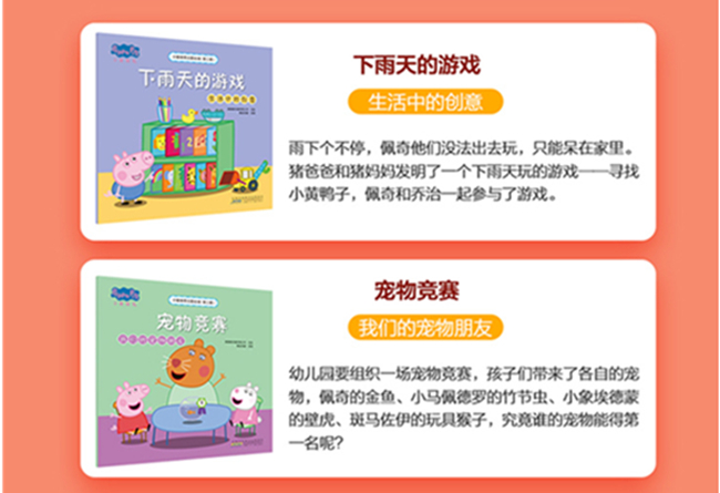 本系列是《小猪佩奇主题绘本》第三辑,推出的全新五个故事。大开本,配套导读,让孩子和家长共同沉浸在美图美文的世界里。每册书围绕一个主题,展现和谐、自由、宽松的家庭环境,猪妈妈、猪爸爸和其他家长、老师们,为孩子们打开一扇门、一扇窗。5个生动有趣的小故事,5个发人深省的育儿主题,既是小读者的好伙伴,又是学做智慧父母的好帮手。无论小读者还是大读者,在阅读过程中都能分享成长的快乐,领悟美满家庭与亲子共同成长的秘诀。