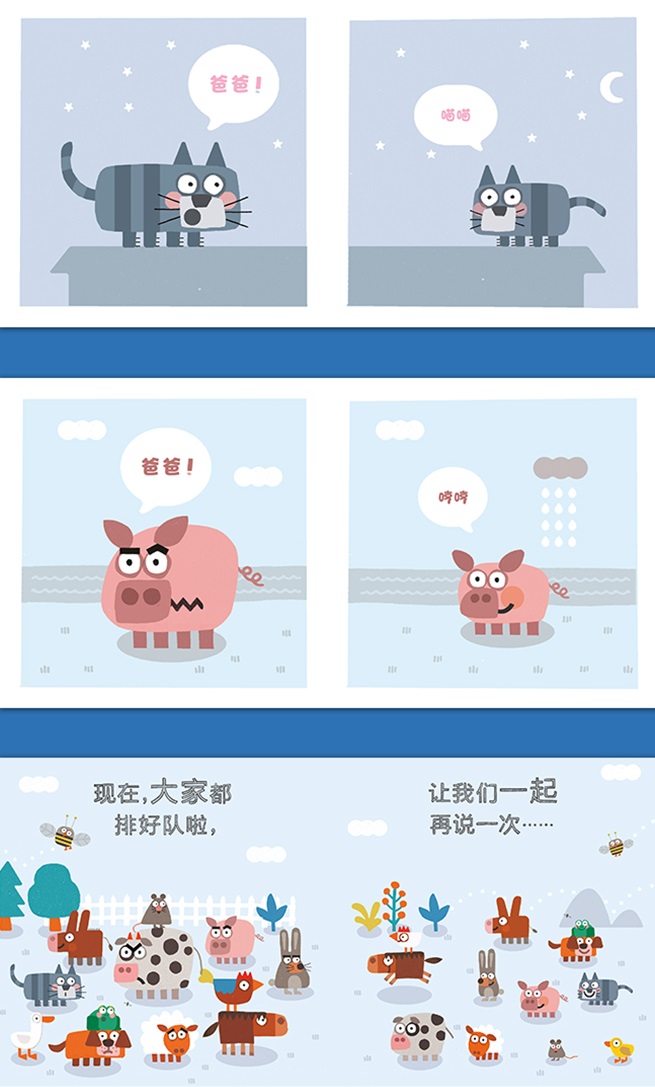 许多动物爸爸都希望自己的宝宝学会的*个词是“爸爸!”,为此他们进行了一场练习。然而,不论是哪位爸爸,在教宝宝说“爸爸”之后,宝宝都本能地发出了自己的叫声。直到*后,当所有动物爸爸和宝宝聚到一起时,宝宝们终于大声地叫出:“爸爸!”令每一位爸爸都兴奋不已。