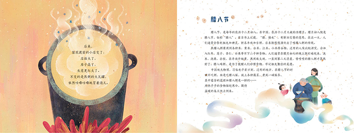 腊八节是中国人特别看重的一个节日,俗话说,过了腊八就是年,从这一天起,年味儿就一天比一天浓。绘本通过一罐香甜的腊八粥,引出了一段带着江南水乡风韵的爱情故事,随风飘逝的梨花、冒着香气腊八粥、延伸到远方望不见边际的河,都是阿香婆对阿祥的思念,水墨画的风格宁静而忧伤。故事反映了战争的残酷,阿香和阿祥对爱情的忠贞和游子对家乡的深深思念。一罐腊八粥,不仅是为了提醒人们珍惜食物,牢记祖先勤俭的美德,还表达了中国人期盼远方亲人归来,期盼团圆的诚挚情感。