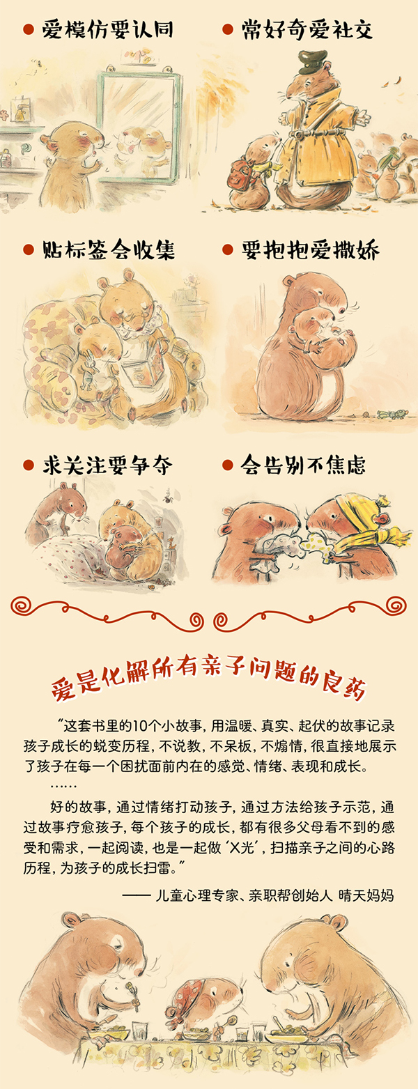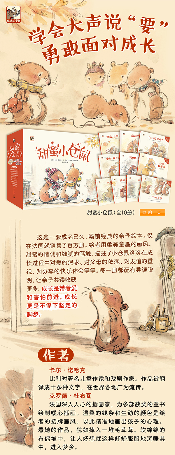 这是一套的子互动图画书。仅在法国就销售了百万册。绘者用柔美童趣的画风、甜蜜的情调和细腻的笔触,描述了小仓鼠洛洛在成长过程中对爱的渴求、对父母的依恋、对友谊的重视、对分享的快乐体会等等。每一册都配有导读说明,让子共读收获更多:爱——解决子问题的良药。成长是带着爱和害怕前行;成长更是不停下前进的脚步。 全书帮助小读者解决成长中的小问题,分别是:1. 洛洛,生日快乐!——学会与人分享;2. 洛洛公主——学会与人相处;3. 你还爱我吗?——学会表达需求;4 欧耶,我长高啦!——学会快乐;5. 我的好朋友——学会面对分离;6. 好爱好爱你——学会表达爱;7. 我最可爱!——学会自信自爱;8. 我的心肝宝贝——学会与人共情;9. 幸福盒子——学会珍惜所有;10. 一个吻太短——学会勇敢说要