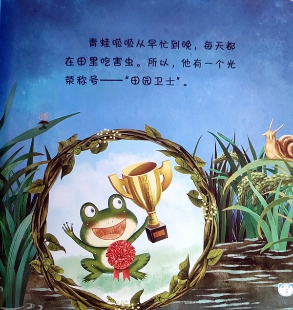 《光荣的大红花》:青蛙呱呱从早忙到晚,每年都在田里吃害虫,他是光荣的“田园卫士”;啄木鸟专吃危害树木的害虫,是有名的“树医生”。猫捉老鼠,狗在看门,牛在犁地,人离不开这些动物,它们与人类的生活紧密相关。而“我”——中国大熊猫,是中国人民和世界人民的友好使者。