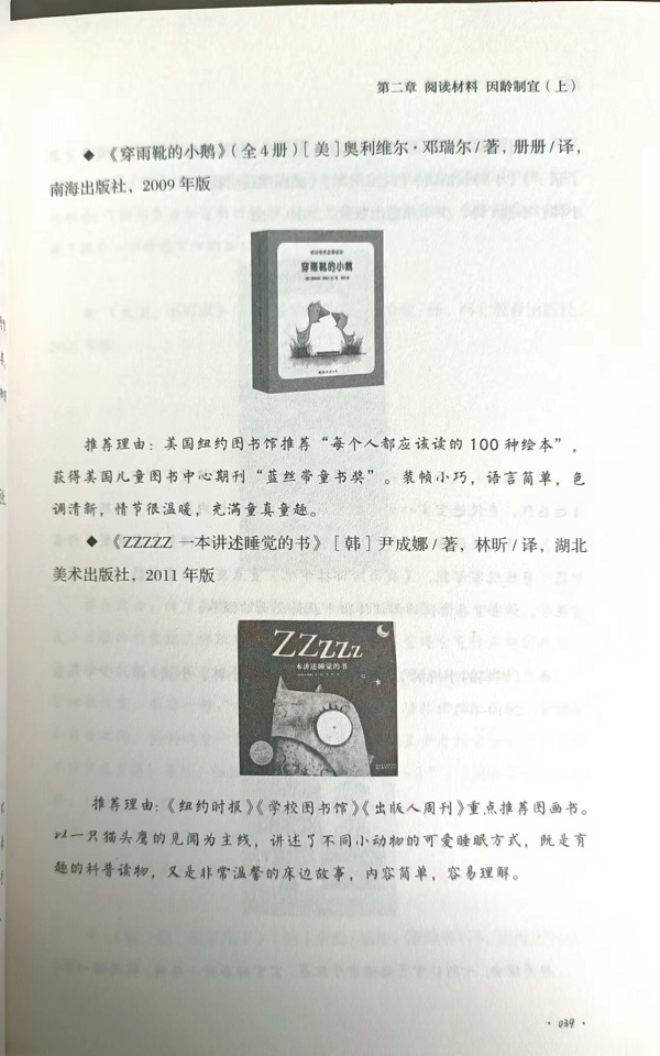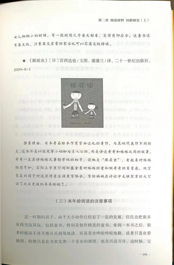 章 阅读习惯 随机培养 “小书虫”桐桐的成长之路 002 (一)“浸润式”的阅读教育 002 (二)某画报带来的转折 003 (三)“怪异”的爱书行为 003 (四)享受亲子“悦读”时光 004 (五)爱上独立阅读 004 培养早期阅读习惯的几个要点 005 (一)可以考虑从胎教开始 006 (二)让图书和阅读成为孩子生活秩序的一部分 008 (三)合适的阅读材料或有决定性的影响 008 (四)父母的参与及参与的方式非常重要 009 (五)尊重孩子阅读兴趣的独特表达方式 010 (六)适当赞美巩固习惯生成中的点滴进步 011 (七)借助老师的力量引导孩子爱上阅读 011 第二章 阅读材料 因龄制宜(上)——0-3 岁的童书选择 0 - 1 岁宝宝的阅读计划 014 (一)“阅龄”特点 014 (二)适合的读物 016 1 - 2 岁宝宝的阅读计划 028 (一)“阅龄”特点 028 (二)适合的读物 030 (三)本年龄阅读的注意事项 043 2 - 3 岁宝宝的阅读计划 044 (一)“阅龄”特点 044 (二)适合的读物 045 第三章 阅读材料 因龄制宜(下)——3-6 岁的童书选择 3 - 4 岁宝宝的阅读计划 066 (一)“阅龄”特点 066 (二)适合的读物 068 4 - 5 岁宝宝的阅读计划 095 (一)“阅龄”特点 095 (二)适合的读物 096 5 - 6 岁宝宝的阅读计划 115 (一)“阅龄”特点 115 (二)适合的读物 116 (三)3-6 岁孩子阅读的相关注意事项 144 第四章 给孩子一个书香童年 谈谈孕期的阅读 148 早期阅读的价值在于其娱乐性 149 (一)童书是为了孩子的快乐存在的 151 (二)早期阅读的价值在于其娱乐性 152 (三)早期阅读的娱乐性自有其价值 154 把早期阅读的娱乐性进行到底 156 (一)允许孩子“玩”书 156 (二)尊重孩子独特的阅读习惯 157 (三)不给孩子制定太多的阅读规矩 157 (四)允许孩子重复喜欢的书 158 (五)尽量让孩子参与选书 158 (六)阅读过程跟着孩子的感觉走 159 (七)读完不提过多要求 159 (八)允许孩子读无用的书 160 打造能唤起孩子阅读欲望的图书环境 161 (一)书架的选择和摆放大有学问 161 (二)图书封面*好朝外陈列 162 (三)阅读区域*好放上地垫、枕头、垫子等 163 (四)图书摆放*好遵循一定的原则 164 亲子阅读的“前奏”和“续章” 165 (一)亲子阅读的“前奏” 165 (二)亲子阅读的“续章” 167 说说早期阅读的多元性 168 撕书,不是你想象的那么可怕 170 说说早期阅读中的“重复”现象 174 (一)重复让知识技能的学习和输出成为可能 175 (二)重复让孩子有机会面对其内心的某种体验 175 (三)重复让事物变得可以预测,进而增强孩子的自信 176 绘本图文,谁更给力? 178 “诵读”胜于“编读” 181 亲子共读的价值是自主阅读难以替代的 183 (一)亲子共读:那些鲜为人知的价值 184 (二)别把自主阅读和亲子阅读截然分开 186 (三)循序渐进地过渡到自主阅读 187 阅读中的亲子互动要自然 187 (一)选择能激发孩子互动欲望的阅读材料 187 (二)互动方式应适合孩子的年龄特点 188 (三)努力创新亲子互动技巧 189 提供科普读物要注意保护孩子的想象力 189 童书选购那些事儿 191 (一)童书选购的“大原则” 191 (二)童书选购的“小窍门” 194 第五章 早期阅读的常见困惑 孩子不爱读书怎么办? 202 阅读时要不要教孩子认字? 204 要给孩子制定阅读规矩吗? 205 早期阅读需要固定时间吗? 206 如何看待早期阅读中的指读? 207 孩子突然不爱阅读了怎么办? 207 孩子只对特定的书和内容感兴趣怎么办? 208 杂志和图书同样有价值吗? 209 识字的孩子还要陪读吗? 210 该不该让孩子自己选书呢? 211 孩子对读物的注意力与我们不同步怎么办? 211 孩子喜欢看很幼稚的读物怎么办? 213 妈妈不理解绘本的内蕴怎么办? 213 孩子不喜欢读新买的书怎么办? 214 阅读后要立即引导孩子思考书中的内容吗? 215 孩子的阅读习惯养成后家长还可以做些什么? 216 家长亲自阅读好还是播放音频好? 216 孩子不爱看文字书怎么办? 217 拿着书读给孩子好还是撇开书讲故事好? 218 孩子看书喜欢随大流怎么办? 218 给孩子读书,几天增加一本新书好? 219 能不能让孩子接触改编后的名著? 219 附 一 桐桐妈的育儿观 221 附 二 桐桐妈的早期阅读观 222 附 三 我和桐桐喜欢的200 本童书 224 后 记 235