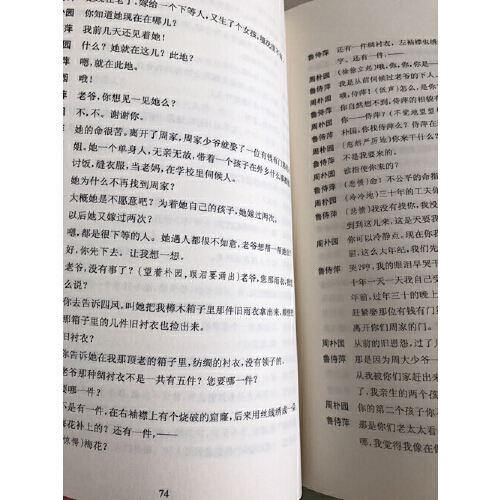 墙的颜色是深褐,年久失修,暗得褪了色。屋内所有的陈设都很富丽,但现在都呈现着衰败的景色。——右墙近前是一个壁炉,沿炉嵌着长方的大理石,正前面镶着星形彩色的石块;壁炉上面没有一件陈设,空空地,只悬着一个钉在十字架上的耶稣。现在壁炉里燃着煤火,火焰熊熊地,照着炉前的一张旧圈椅,映出一片红光,这样,一丝丝的温暖,使这古老的房屋还有一些生气。壁炉旁边搁放一个粗制的煤斗同木柴。右边门左侧,挂一张画轴;再左,近后方,墙角抹成三四尺的平面,倚的那里,斜放着一个半人高的旧式紫檀小衣柜,柜门的角上都包着铜片。柜上放着一个暖水壶,两只白饭碗,都搁在旧黄铜盘上。柜前铺一张长方的小地毯;在上面,和柜平行的,放一条很矮的紫檀长几,以前大概是用来摆设瓷器、古董一类的精巧的小东西,现在堆着一叠叠的白桌布,白床单等物,刚洗好,还没有放进衣柜去。在正面,柜与壁龛中间立一只圆凳。壁龛之左(中门的右面),是一只长方的红木菜桌。上面放着两个旧烛台,墙上是张大而旧的古油画,中间左面立一只有玻璃的精巧的紫檀柜。里面原为放古董,但现在是空空的,这柜前有一条狭长的矮凳。离左墙角不远,与角成九十度,斜放着一个宽大深色的沙发,沙发后是只长桌,前面是一条短几,都没有放着东西。沙发左面立一个黄色的站灯,左墙靠前略凹进,与左后墙成一直角,凹进处有一只茶几,墙上低悬一张小油画。茶几旁,再略向前才是左边通饭厅的门。屋子中间有一张地毯。上面对放着,但是略斜地,两张大沙发;中间是个圆桌,铺着白桌布。