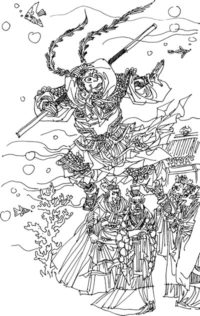 一天,天气酷热难当,石猴和一群猴子们一起,躲在松阴下面嬉戏避暑,只见有的猴子在树间跳来跳去,攀爬嬉闹,采花觅果;有的玩弄石子和沙子,刨沙坑、堆沙雕;有的追蜻蜓、扑蚂蚱,扯藤条编帽子;还有的坐在那里捉虱子、捋毛发,一派热闹景象。玩了一会儿,几只猴子提议去山涧里洗澡。于是,一群猴子前呼后拥,有说有笑地来到了一个山泉旁。