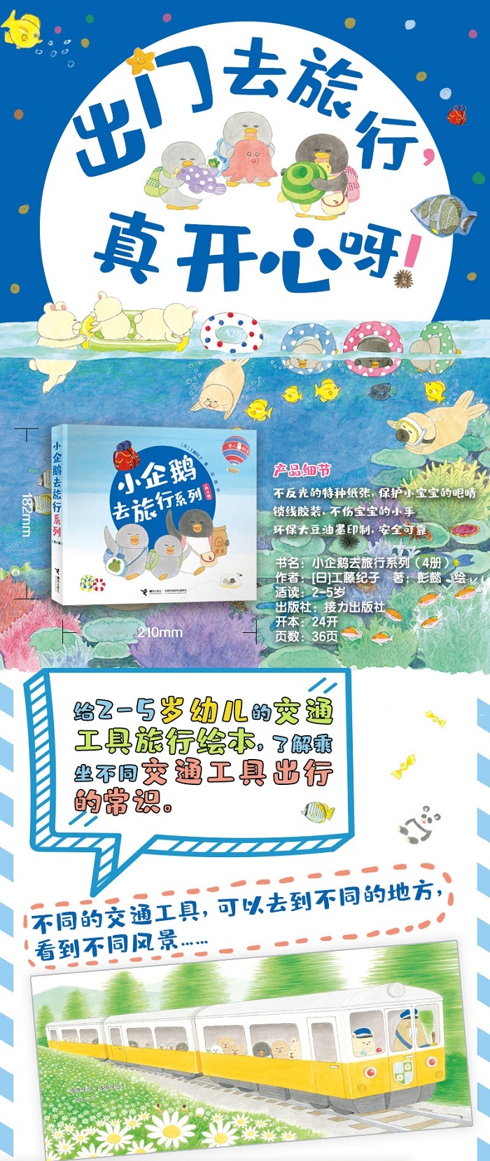 碧蓝的大海、壮观的鱼群、好吃的野餐……快来和小企鹅姐弟一起,快快乐乐地坐着轮船去旅行吧!