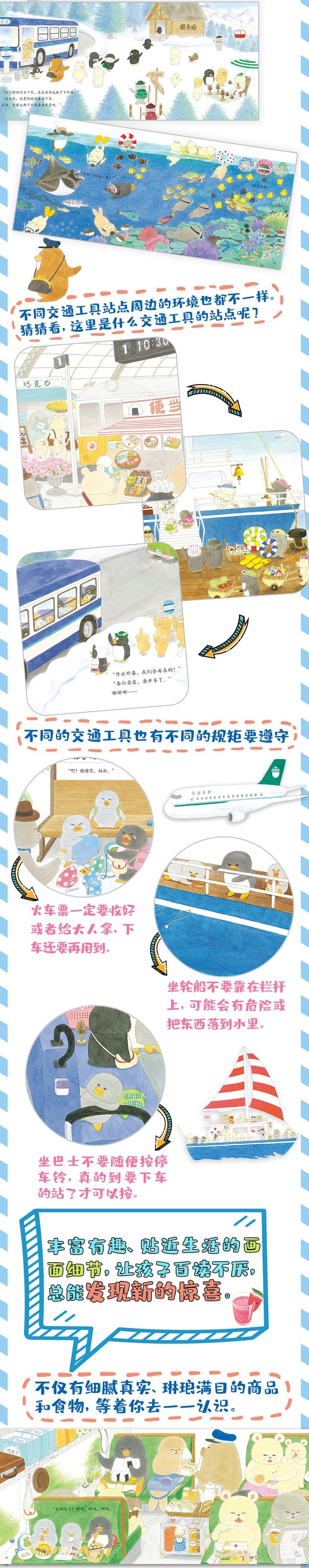 本系列的画面细节非常丰富,非常耐读,信息含量远远超过同类图画书。不仅栩栩如生地描绘出热闹的站前商业街、丰盛美味的飞机餐、美丽的森林观景台、琳琅满目的机场商店……让孩子仿佛真的跟随着小企鹅姐弟坐着各种交通工具,去各式各样的地方旅行。而且在文字讲述的故事之外,书中还隐藏了许许多多有趣的小细节,能让孩子获得反复阅读、不断发现新的隐藏细节和故事的乐趣,从而锻炼孩子的观察、联想、推理、思考的能力。