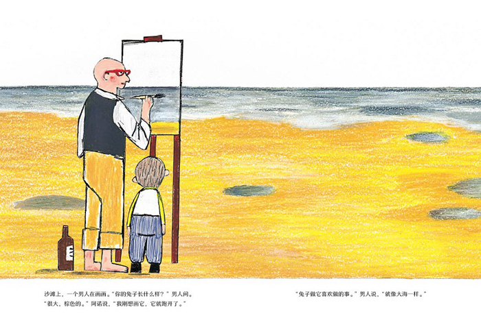 沙滩上的男人告诉他兔子做它喜欢做的事。阿诺*后在一堆沙子里发现了兔子。兔子跟阿诺回了家。兔子刨了一天沙