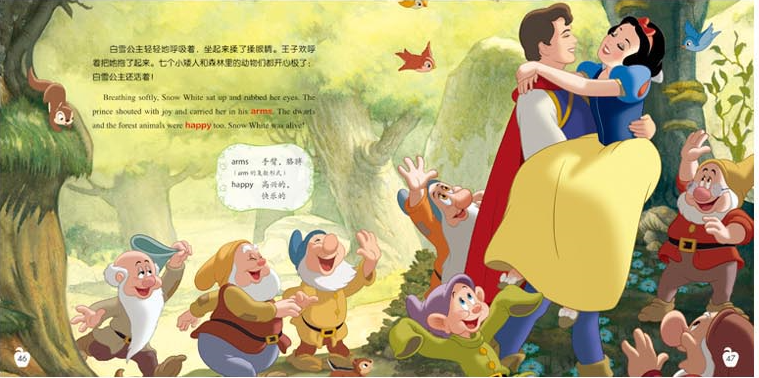 善良的白雪公主因为美丽的外貌而遭到继母王后的妒忌。王后命令猎人杀死白雪公主,猎人不忍心伤害白雪公主,于是让她逃进了森林里。白雪公主在小动物的帮助下,找到了七个小矮人的小木屋并且和他们成为了好朋友。王后知道白雪公主还活着以后,化妆成一个老太婆,哄骗白雪公主吃下了毒苹果。白雪公主就这样沉睡不醒,直到一直仰慕她的王子出现,用一个真爱之吻唤醒了白雪公主……
