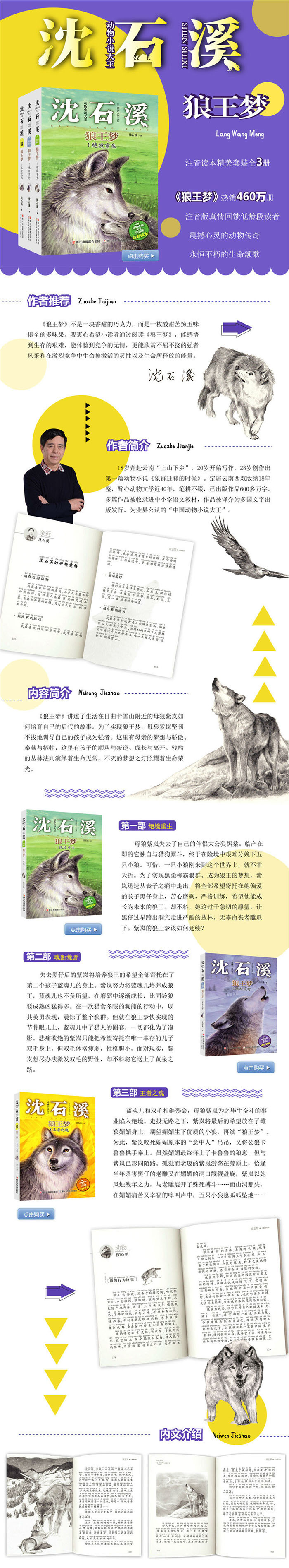 “动物小说大王沈石溪•注音读本”是基于“动物小说大王沈石溪·品藏书系”为小学低龄段读者开发的全新品种,图书配置了精美黑白插图外,同时配有动物档案,形象生动地介绍了不同动物的知识和奇闻趣事,为读者更科学全面地了解动物世界提供了全面详实的资料。书后附有沈石溪档案,多方位呈现动物小说大王的精彩人生。