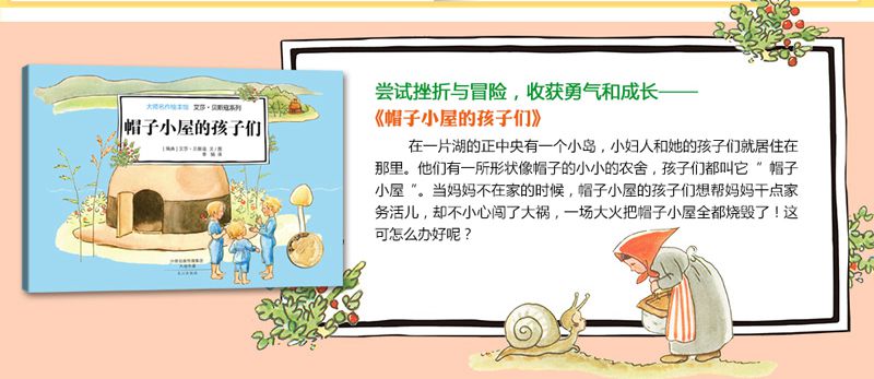 在一片湖的正中央有一个小岛,小妇人和她的孩子们就居住在那里。他们有一所形状像帽子的小小的农舍,孩子们都叫它“帽子小屋”。当妈妈不在家的时候,帽子小屋的孩子们想帮妈妈干点家务活儿,却不小心闯了大祸,一场大火把帽子小屋全都烧毁了!这可怎么办好呢?