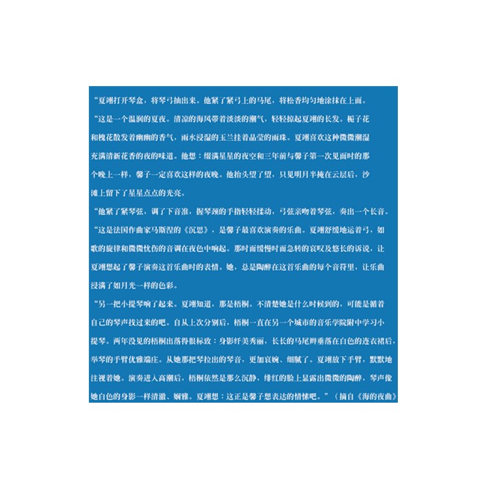 夏翊和梧桐站在她的身后,还有冲进后台的常老师,几个人努力克制住自己的失态,默默聆听着馨子的演奏。可是,在前台嘈杂的伴奏乐曲中,提琴的声音是那样微弱和无助,很快就湮没了。