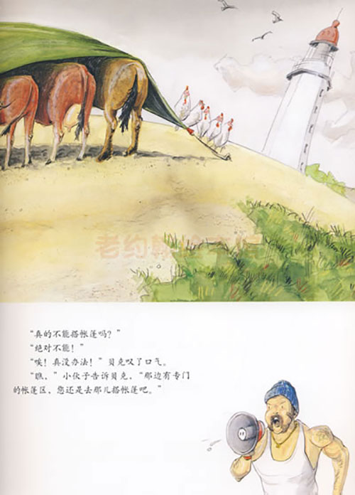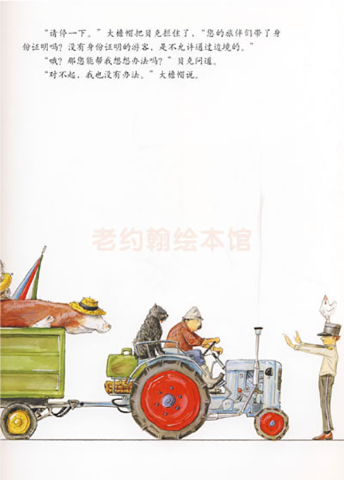 没错,《农夫去旅行》和那两本类似的图画书相似在人?动物的和睦相处上。但是,还有些不同的东西。