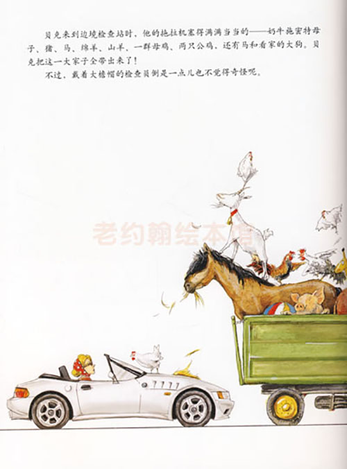 贝克开着拖拉机。他的狗儿坐在他的身后。后面的拖车里呢,是一匹马一头奶牛一头小牛犊一只绵羊一只山羊一头猪五只母鸡两只公鸡。这些动物们第一次跟着农夫出门度假,乐不可支哦。马在吃草,山羊踩在马脖子上,两只公鸡一如既往地在彼此吹胡子瞪眼,母鸡们似乎在炫耀自己的飞行技巧或者“白鸡独立”的倩影(在路过边境检查站的时候,一只母鸡落在了后面那位美女开的敞篷车上,还有一只则落在了边境检察院的大檐帽上),绵羊套着游泳圈,奶牛戴着主人的礼帽,只有那头猪算是很老实吧,一动不动地瞧着路边的风景。