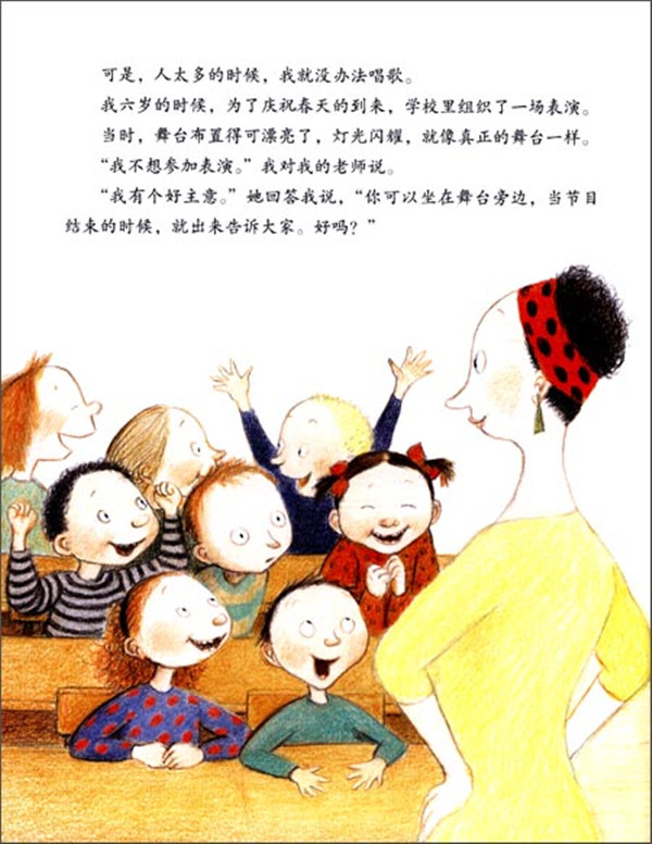 “我常常唱歌给我的弟弟听,他很喜欢。他最喜欢的是我专门为他编的歌。但是我不喜欢在正式场合唱歌。我们马上就要去参加学校春季表演了,在真正的舞台上真正的灯光下。我要穿什么衣服呢?” 当你害怕自己在众人面前出丑时,世界变得如此恐怖。更有甚者,当你被逼站在舞台上面对一群人时,灾难正在逼近。但是,有时为了某个人,你必须鼓起勇气试一试。本册图画书用诗意的、细腻的感情,书写了幽默诙谐的克服内心恐惧的方法。