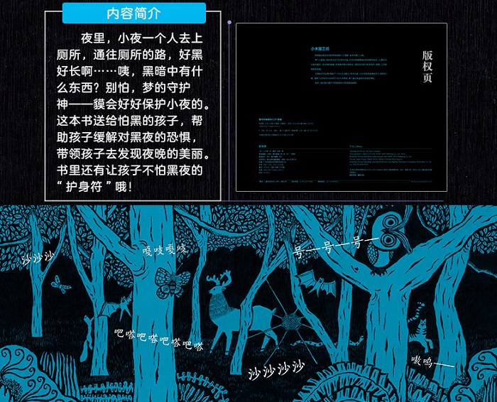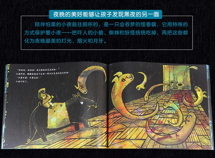 这本书送给怕黑的孩子,帮助孩子缓解对黑夜的恐惧,带领孩子去发现夜晚的美丽,书里还有让孩子不怕黑夜的“护身符”哦!夜晚,小夜怎么也睡不着,她想去上厕所,却又觉得在黑夜很可怕。正当她纠结难受的时候,她的毛丶毯竟然变成了一只会吞吃梦的怪兽貘!小夜在它的陪伴下,勇敢踏上了前往厕所的路。在那条比白天长得多的路上,出现了许多吓人的东西 偷宝石的邪恶小偷,恼人的巨大蜘蛛,还有可怕的小鬼怪!貘一口就将这些可怕的东西吞了下去,然后将这些用特别的方式变成了夜晚闪烁的灯光、绚烂的烟火和弯弯的月牙。有了貘的陪伴,看到了夜晚的美丽景色,小夜再也不会害怕夜晚了。本书是日本新生代绘本作家组合——小木屋工坊首本引进中国的绘本,他们以在木板上作画为特色,每张图画都可以看到木纹的肌理,质感十足,这也是他们以“小木屋工坊”为组合名的原因。他们的作品关注孩子的心灵世界,擅长选取贴合孩子日常生活的主题,并且以丰富的想象力构造出充满巧思的故事。