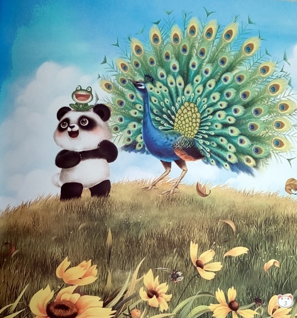 《孔雀开屏啦》:秋高气爽,熊猫咪咪和青蛙呱呱跟着孔雀看到美丽的蓝天白云、五颜六色的菊花、金黄的银杏树、硕果累累的果园、丰收的玉米和稻田、辛勤劳作的农民伯伯……秋天的景色真美,劳动的人 !美好的景色和人,让爱美的孔雀开了屏。